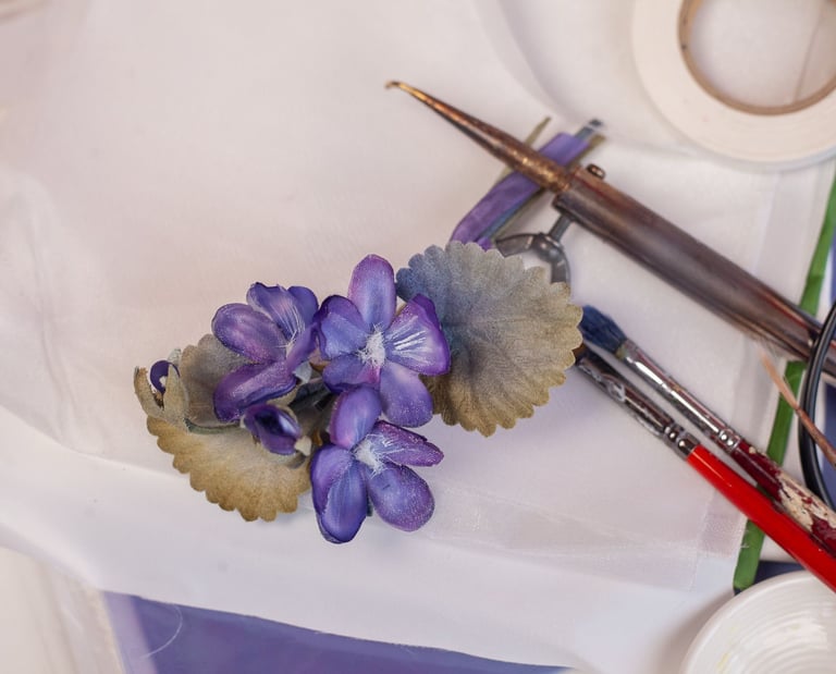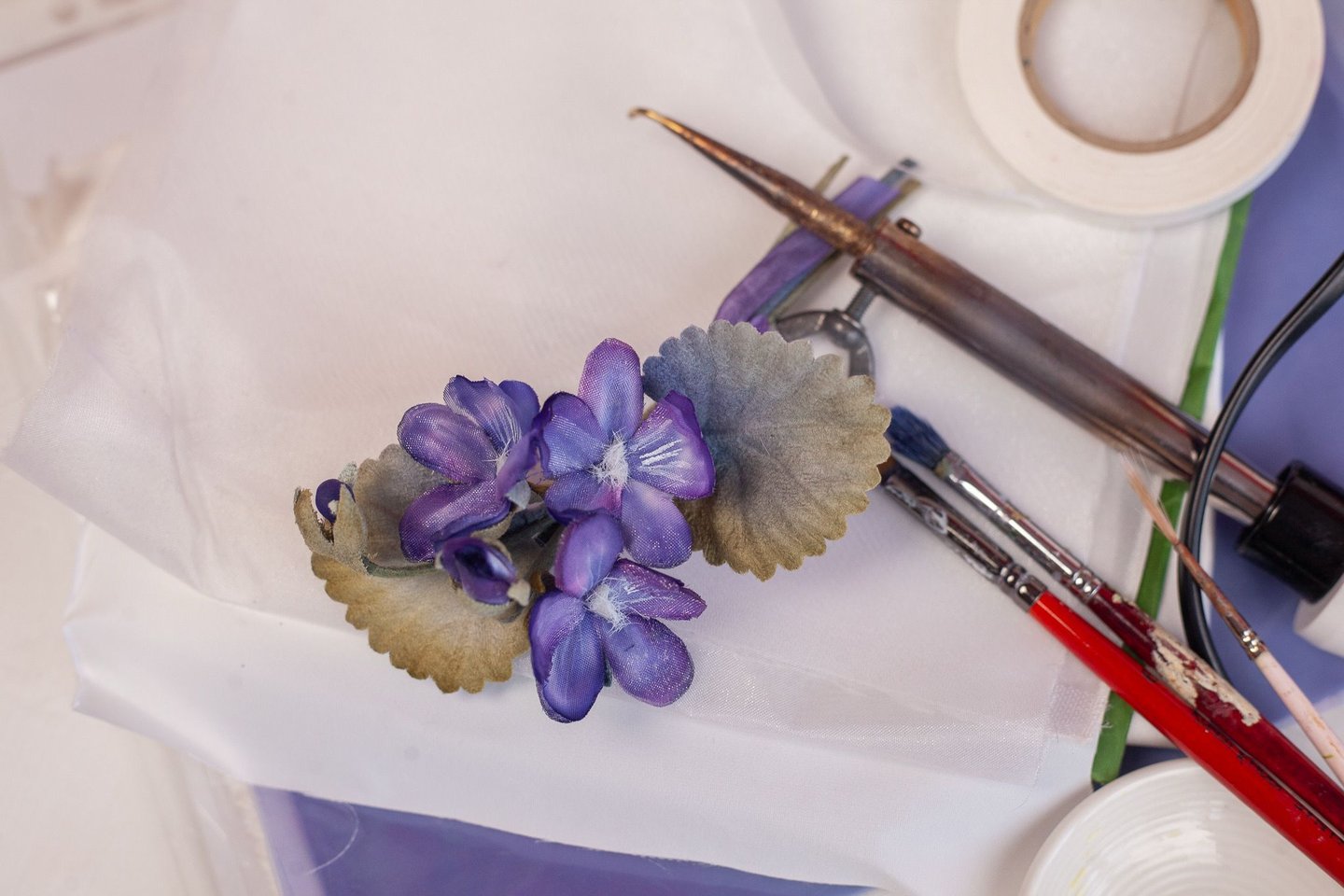 💐 Вы научитесь работать с японскими тканями и горячими инструментами, использовать различные материалов, создавая изящный букетик фиалок.